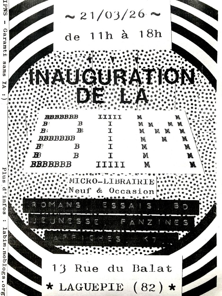 - 21/03/26, de 11h à 18h : Inauguration de la Bouquinerie Infokiosque Modeste @ Laguépie (82)